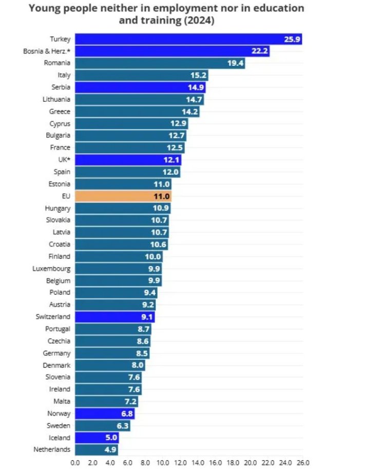 România e în topul țărilor europene cu cei mai mulți tineri care nici nu studiază, dar nici nu lucrează. Media în Europa anul trecut era de 11%. Procentul în România era, în schimb, de 19,4%. UE își propune să coboare procentul general la nivelul întregului bloc comunitar sub 9%, până în 2030.