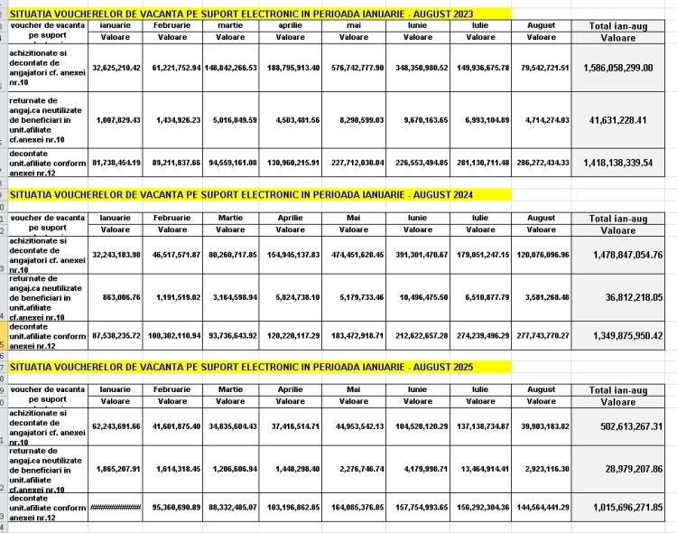 Conform datelor primite de la Ministerul Finanțelor, în primele 8 luni din 2025, numărul voucherelor de vacanță emise a fost cu 66% mai mic comparativ cu intervalul similar din 2024, în timp ce numărul voucherelor decontate a scăzut cu 24,7%.